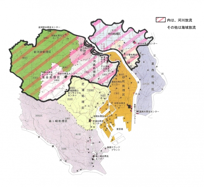 特別区の区域内ではこちらの図のように2通りの区域(河川を放流先とする下水道の処理区と海域を放流先とする下水道の処理区)に分類されます。