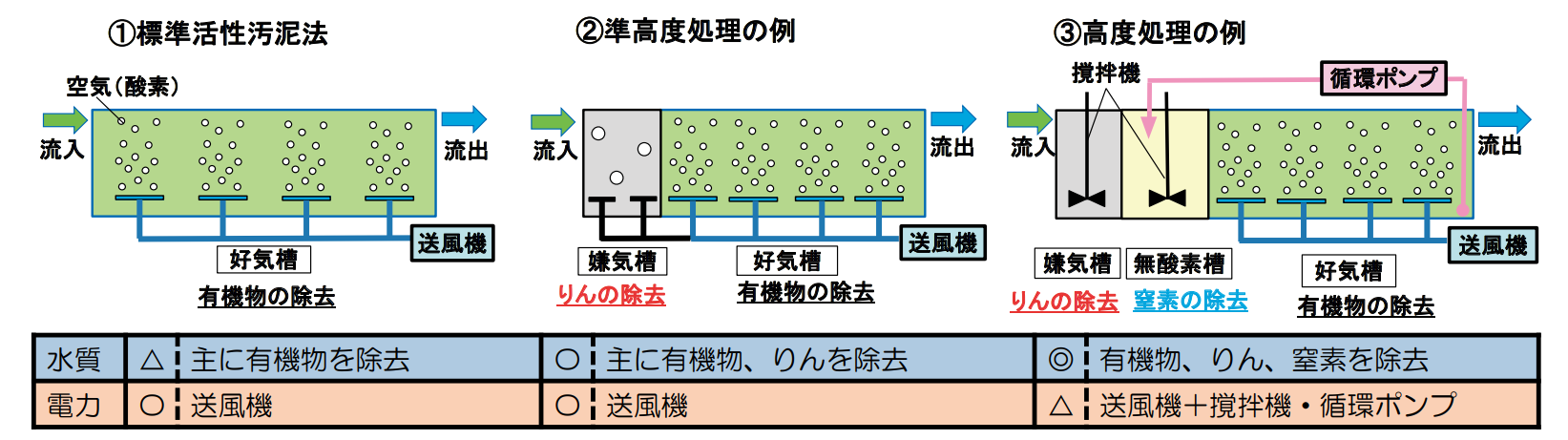 - 当局では、ちっ素、りんをより多く除去できる準高度処理や高度処理等の導入を進めています。