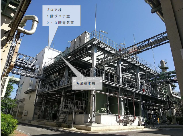 これまで、紹介していなかった角度からの写真となります。汚泥脱水機の防音箱が少し見えています。