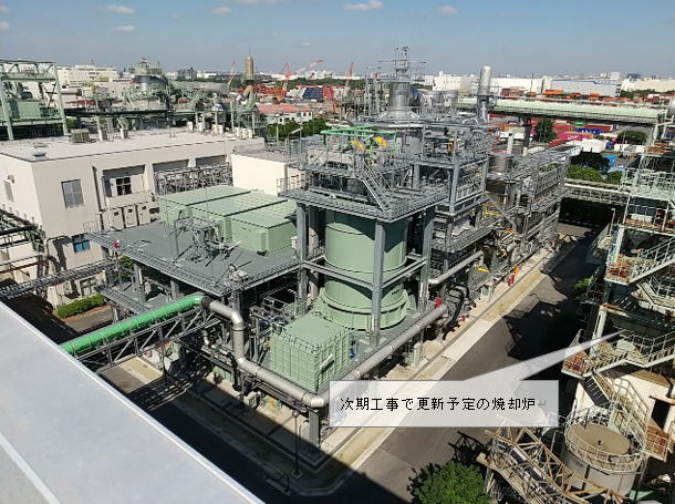 右手前に見える焼却炉は、次期工事で更新予定のものです。今後、この焼却炉を撤去し、空いたスペースに新しい焼却炉を建設します。